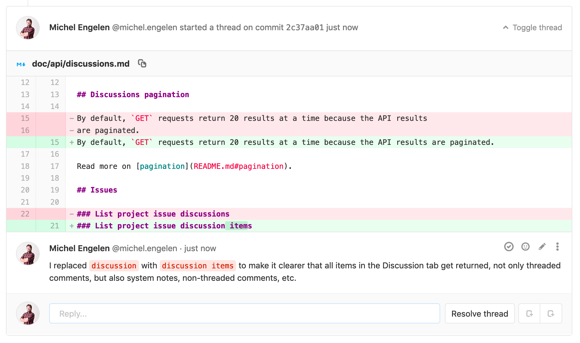 Any threads created this way are shown in the merge request's Discussions tab and are resolvable.